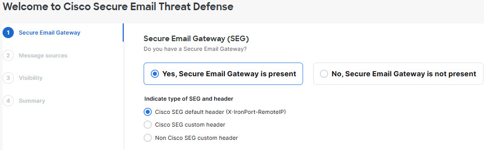 Regardless of your message source (chosen in the next section), it is important to indicate that a Secure Email Gateway (SEG) is present and which header can be used to identify it in incoming journals so Secure Email Threat Defense can determine the true originating sender of a message. Without this configuration, it may appear that all messages come from the SEG, which could result in false positive convictions..