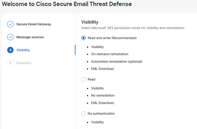 Read and Write — Allows visibility and on-demand or automated remediation (that is, move or delete suspect messages). Read and write permissions will be requested from Microsoft 365.
